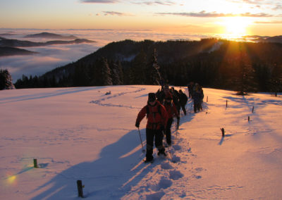 Alle Gruppen in den Wintercamps nutzen Schneeschuhe als Fortbewegungsmittel. Durch diese gewollt langsame Bewegung lernen die Teilnehmer*innen, die umgebende Natur intensiv mit allen Sinnen wahrzunehmen. Die Schneeschuhwanderung wird mit einem Geländespiel kombiniert, bei dem die Schüler*innen sich mit der Interaktion zwischen Natursportlern und Wildtieren beschäftigen.